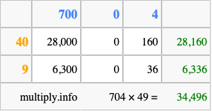 That's all there is to it! As you can see from the box above, the answer to 704 times 49 using the box method is 34,496.