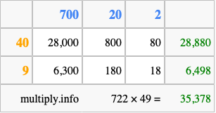 That's all there is to it! As you can see from the box above, the answer to 722 times 49 using the box method is 35,378.