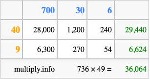 Finally, we add up all the sums we found in step 3 to get our final answer to 736 times 49.