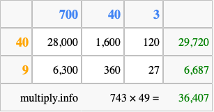 Below is an illustration showing you how to calculate 743 times 49 using the box method, using the instructions above.
