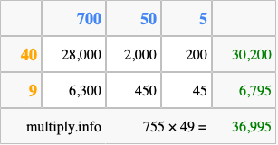That's all there is to it! As you can see from the box above, the answer to 755 times 49 using the box method is 36,995.