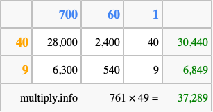 Below is an illustration showing you how to calculate 761 times 49 using the box method, using the instructions above.