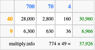 That's all there is to it! As you can see from the box above, the answer to 774 times 49 using the box method is 37,926.