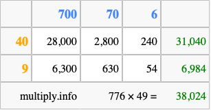Below is an illustration showing you how to calculate 776 times 49 using the box method, using the instructions above.