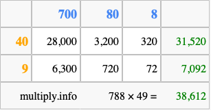 That's all there is to it! As you can see from the box above, the answer to 788 times 49 using the box method is 38,612.