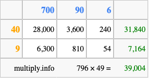 That's all there is to it! As you can see from the box above, the answer to 796 times 49 using the box method is 39,004.