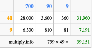 That's all there is to it! As you can see from the box above, the answer to 799 times 49 using the box method is 39,151.