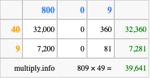 That's all there is to it! As you can see from the box above, the answer to 809 times 49 using the box method is 39,641.