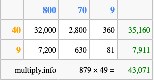 That's all there is to it! As you can see from the box above, the answer to 879 times 49 using the box method is 43,071.