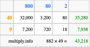 That's all there is to it! As you can see from the box above, the answer to 882 times 49 using the box method is 43,218.