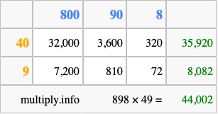 That's all there is to it! As you can see from the box above, the answer to 898 times 49 using the box method is 44,002.