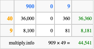 That's all there is to it! As you can see from the box above, the answer to 909 times 49 using the box method is 44,541.