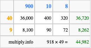 That's all there is to it! As you can see from the box above, the answer to 918 times 49 using the box method is 44,982.