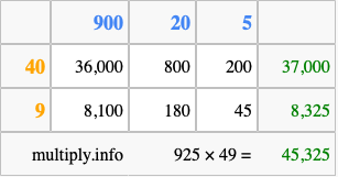 That's all there is to it! As you can see from the box above, the answer to 925 times 49 using the box method is 45,325.