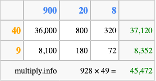 That's all there is to it! As you can see from the box above, the answer to 928 times 49 using the box method is 45,472.