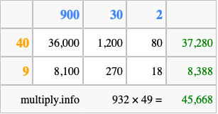 That's all there is to it! As you can see from the box above, the answer to 932 times 49 using the box method is 45,668.