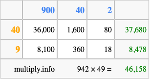 That's all there is to it! As you can see from the box above, the answer to 942 times 49 using the box method is 46,158.