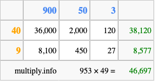 Finally, we add up all the sums we found in step 3 to get our final answer to 953 times 49.