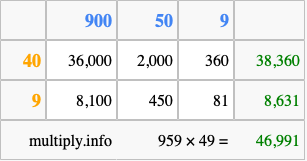 Below is an illustration showing you how to calculate 959 times 49 using the box method, using the instructions above.
