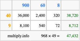 That's all there is to it! As you can see from the box above, the answer to 968 times 49 using the box method is 47,432.