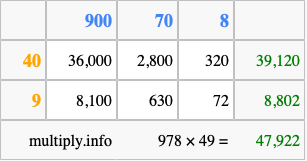 That's all there is to it! As you can see from the box above, the answer to 978 times 49 using the box method is 47,922.