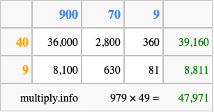 Below is an illustration showing you how to calculate 979 times 49 using the box method, using the instructions above.