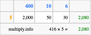 That's all there is to it! As you can see from the box above, the answer to 416 times 5 using the box method is 2,080.