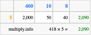 That's all there is to it! As you can see from the box above, the answer to 418 times 5 using the box method is 2,090.