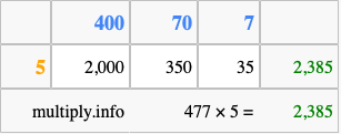 That's all there is to it! As you can see from the box above, the answer to 477 times 5 using the box method is 2,385.
