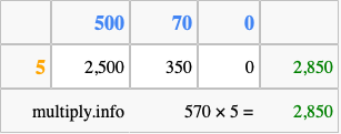 That's all there is to it! As you can see from the box above, the answer to 570 times 5 using the box method is 2,850.