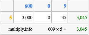 That's all there is to it! As you can see from the box above, the answer to 609 times 5 using the box method is 3,045.