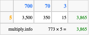 That's all there is to it! As you can see from the box above, the answer to 773 times 5 using the box method is 3,865.