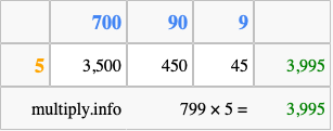 That's all there is to it! As you can see from the box above, the answer to 799 times 5 using the box method is 3,995.