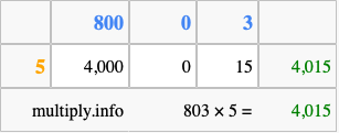 That's all there is to it! As you can see from the box above, the answer to 803 times 5 using the box method is 4,015.