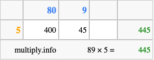 That's all there is to it! As you can see from the box above, the answer to 89 times 5 using the box method is 445.