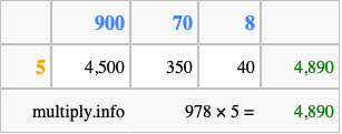 That's all there is to it! As you can see from the box above, the answer to 978 times 5 using the box method is 4,890.