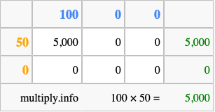 That's all there is to it! As you can see from the box above, the answer to 100 times 50 using the box method is 5,000.