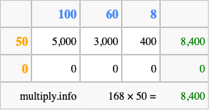 Below is an illustration showing you how to calculate 168 times 50 using the box method, using the instructions above.