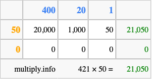 Below is an illustration showing you how to calculate 421 times 50 using the box method, using the instructions above.