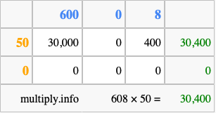 Below is an illustration showing you how to calculate 608 times 50 using the box method, using the instructions above.