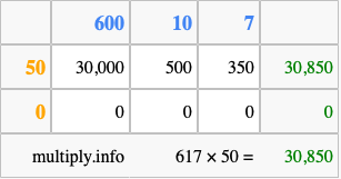 Below is an illustration showing you how to calculate 617 times 50 using the box method, using the instructions above.