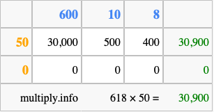Below is an illustration showing you how to calculate 618 times 50 using the box method, using the instructions above.