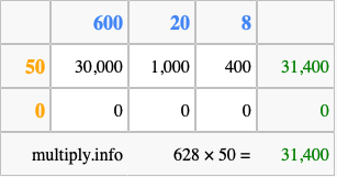 Below is an illustration showing you how to calculate 628 times 50 using the box method, using the instructions above.