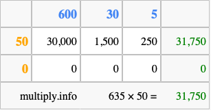That's all there is to it! As you can see from the box above, the answer to 635 times 50 using the box method is 31,750.