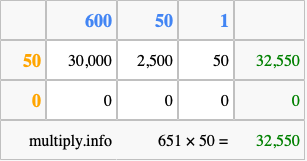 That's all there is to it! As you can see from the box above, the answer to 651 times 50 using the box method is 32,550.