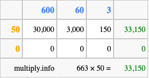 That's all there is to it! As you can see from the box above, the answer to 663 times 50 using the box method is 33,150.