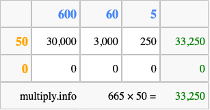 Below is an illustration showing you how to calculate 665 times 50 using the box method, using the instructions above.