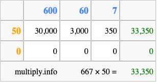 Below is an illustration showing you how to calculate 667 times 50 using the box method, using the instructions above.
