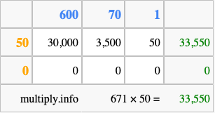 That's all there is to it! As you can see from the box above, the answer to 671 times 50 using the box method is 33,550.