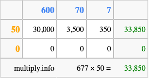Below is an illustration showing you how to calculate 677 times 50 using the box method, using the instructions above.